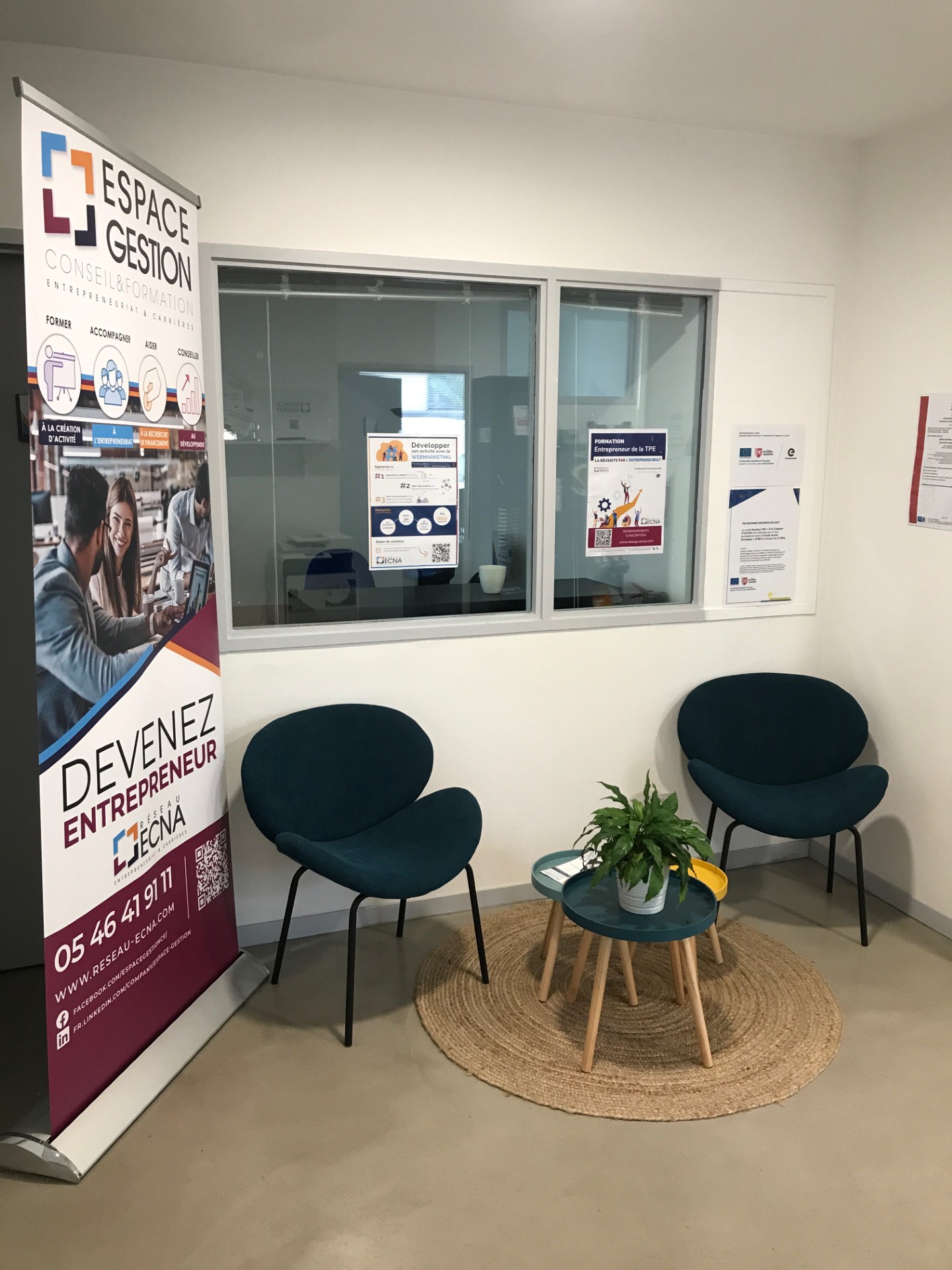 Accueil, Rendez-vous conseils, Formations, Domiciliation, Location de bureaux, et de salle de réunion.