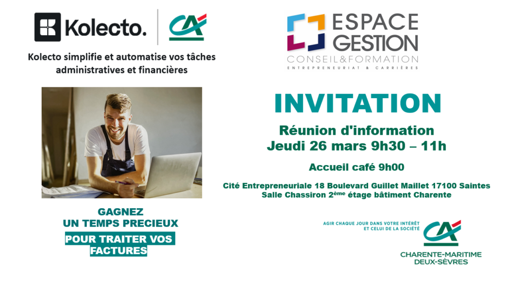 Rejoignez nous jeudi 26 mars à 09h autour d’un « Meet’Up » sous un formatpetit-déjeuner à la Cité Entrepreneuriale, pour une présentation sur la Facturation Electronique et de l’outils « Kolecto », suivi d’un temps d’échanges avec les conseillers d’Espace Gestion et du Crédit Agricole. Mais aussi retrouvez les équipes d’ESPACE GESTION CONSEIL & FORMATION qui vous ont déjà accompagné(e) ! Horaires […]
